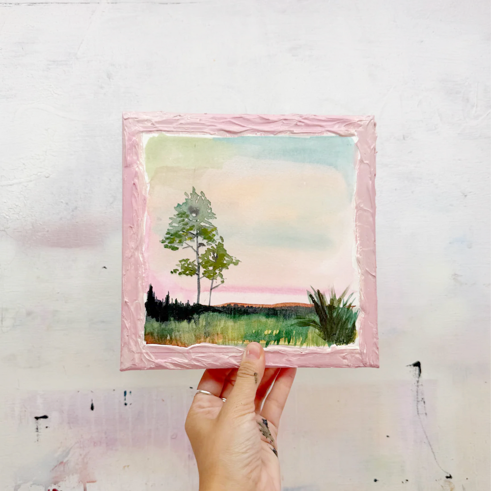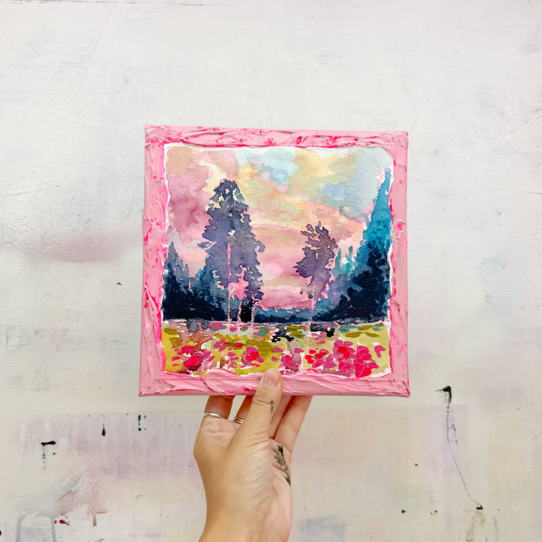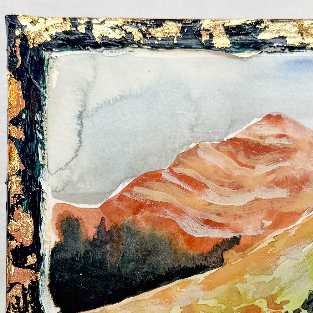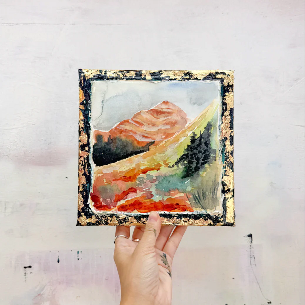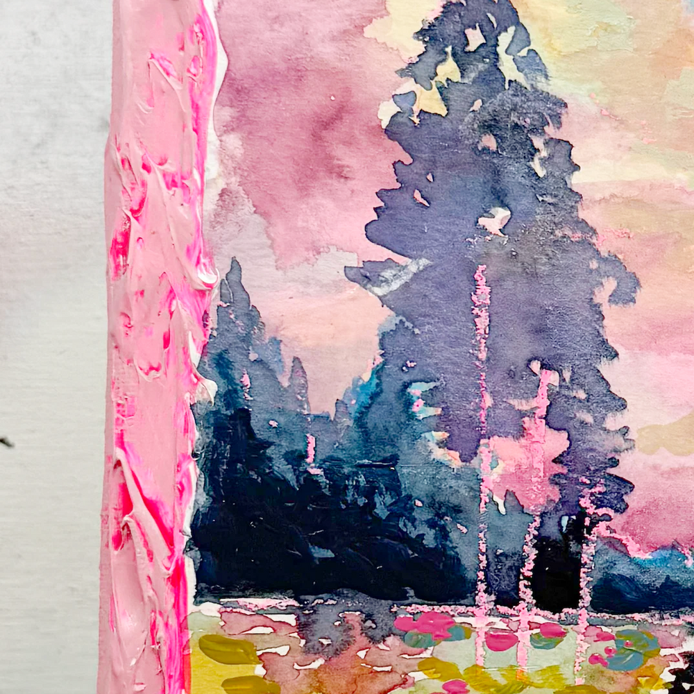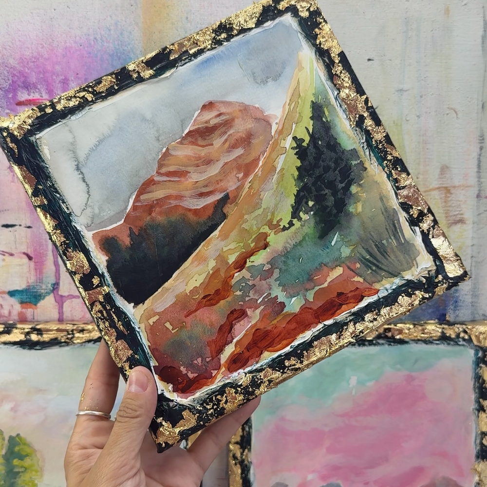 This series is titled Woven Wonderlands because of the uncommon layering of watercolors and acrylics. Inspired by my road trips and travels, each landscape is a representation of my love for exploration of this beautiful world and the supplies I use to recreate it!